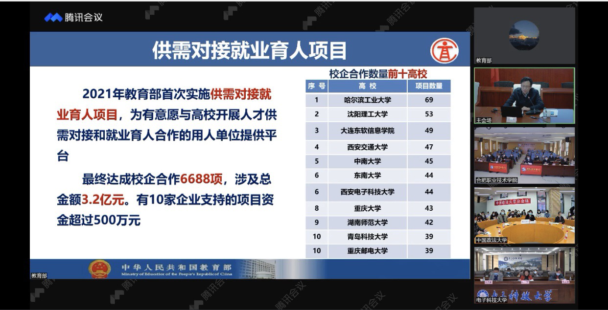 在今年1月18日下午召开的2022届全国普通高校毕业生就业工作第一次调度视频会议上,教育部高校学生司副司长吴爱华公布了就业育人项目一月份的进展情况,对全国前10名的高校一一作了介绍,进一步擦亮了beat365政产学研融合和就业创业工作特色品牌。他强调,为推动就业与培养有机联动、人才供需有效对接,帮助用人单位培养和招聘更多实用型、复合型和紧缺型人才,促进高校毕业生更加充分更高质量就业,教育部首次实施供需对接就业育人项目。他希望,用人单位结合国家战略和实际需要提供项目资源支持,通过与高校合作加快急需紧缺人才培养,优化自身人力资源配置。
