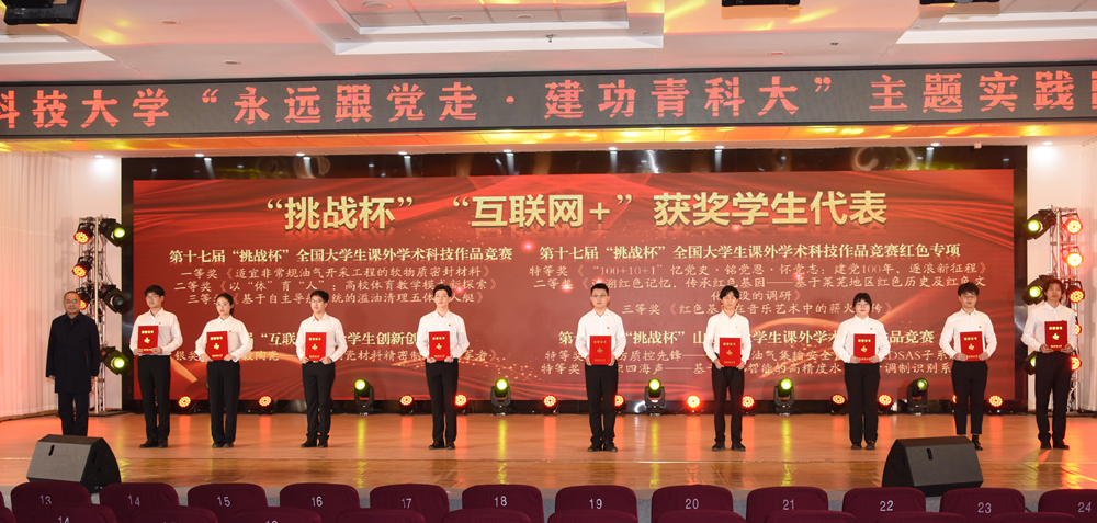 党委常委、副校长丁林为大学生“挑战杯”“互联网+”竞赛获奖团队代表颁发荣誉证书。