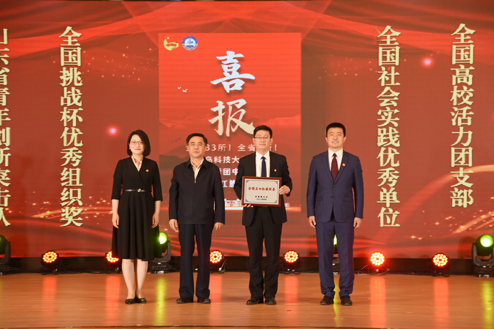 党委书记马连湘为校团委颁授“全国五四红旗团委”奖牌。