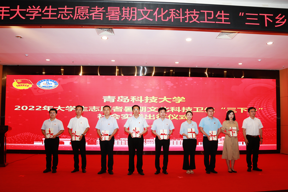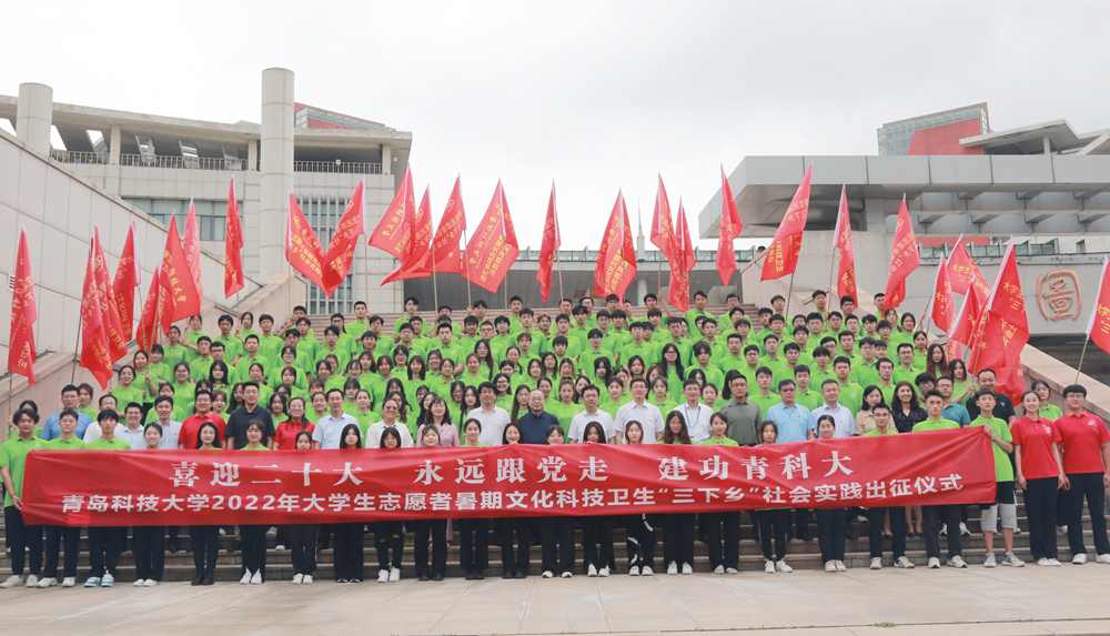 7月5日下午,学校2022年大学生志愿者暑期文化科技卫生“三下乡”社会实践出征仪式在崂山校区英科报告厅举行。党委常委、副校长丁林,党委常委、统战部部长张洪坤出席仪式。1421支大学生暑期“三下乡”社会实践团队出征。