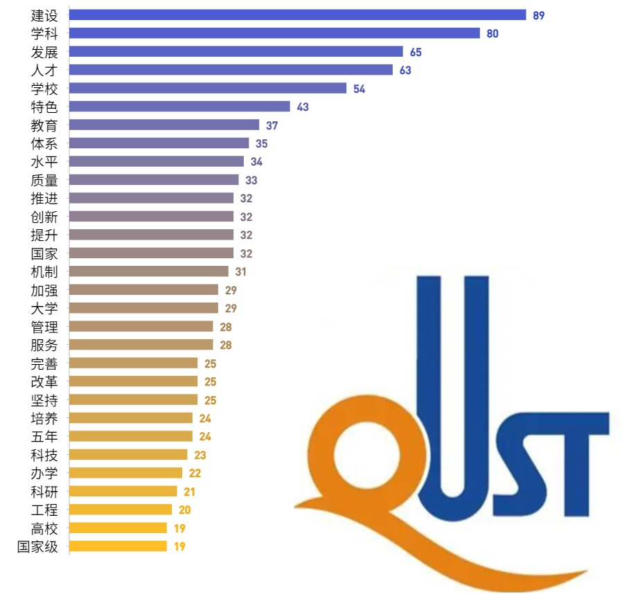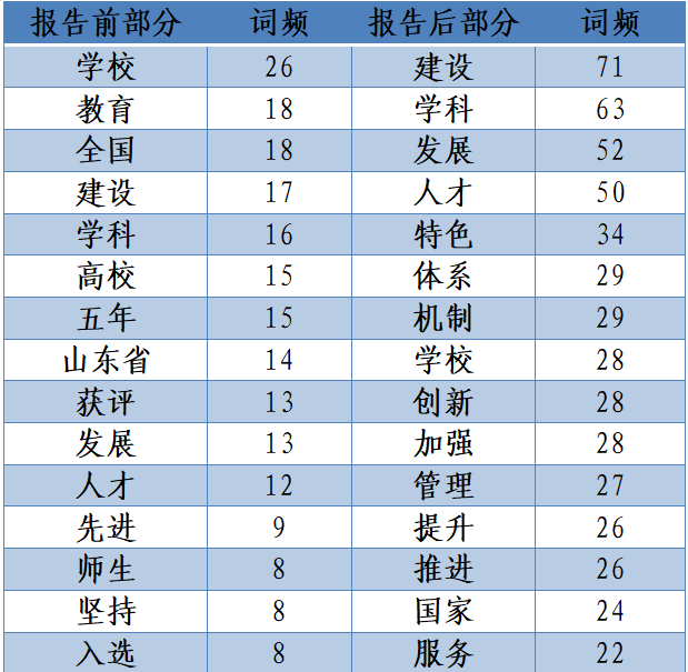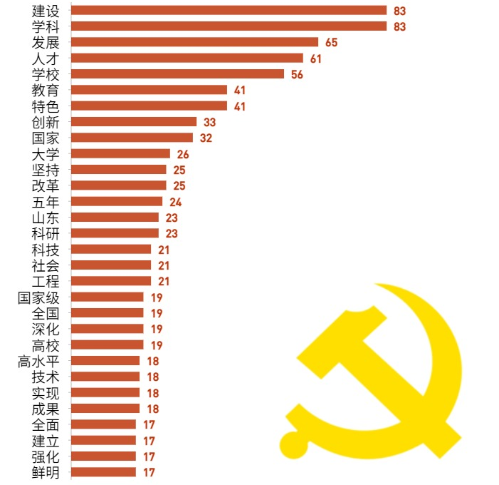 与学校第十次党代会报告相比,“人才”一词从第13名一跃成为第4位,位居本次党代会报告词频前列,排名有了大大的提高;“建设”“发展”“学科”三词一直位居词频统计前三甲,其中“学科”从第三名上升到第二名,在此次党代会中出现的频率变大;“鲜明”“高水平”等在报告中被频繁提起。“治理”“法治”一词首次出现,频率分别高达16次、6次。这些新的“关键词”展示了新理念、新观点,是对学校未来发展的明确回答,也是在实践上作出的新部署。