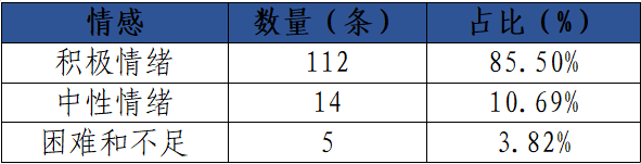 对文档进行一般性行处理,将处理好的文档导入数据分析系统进行文本情感分析(注释:文本情感分析也称为意见挖掘,是指用自然语言处理,文本挖掘以及计算机语言学等方法来识别和提取原素材中的主观信息以及词汇隶属的情感分类),文本情感分析结果如表1、图4所示。