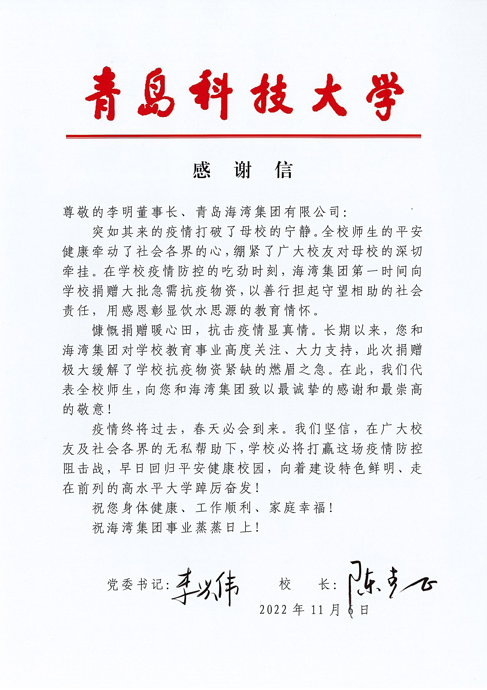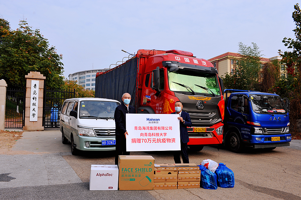 据悉,此次捐赠的防疫物资包括防护服、隔离衣、靴套、隔离面罩、一次性乳胶手套、N95口罩等大批急需抗疫物资,共计70余万元。在学校疫情防控的吃劲时刻,海湾集团第一时间向学校捐赠防疫物资,以善行担起守望相助的社会责任,用感恩彰显饮水思源的教育情怀,充分体现了对学校教育事业的关心支持。党委书记李兴伟、校长陈克正代表学校向李明董事长和青岛海湾集团公司致感谢信。