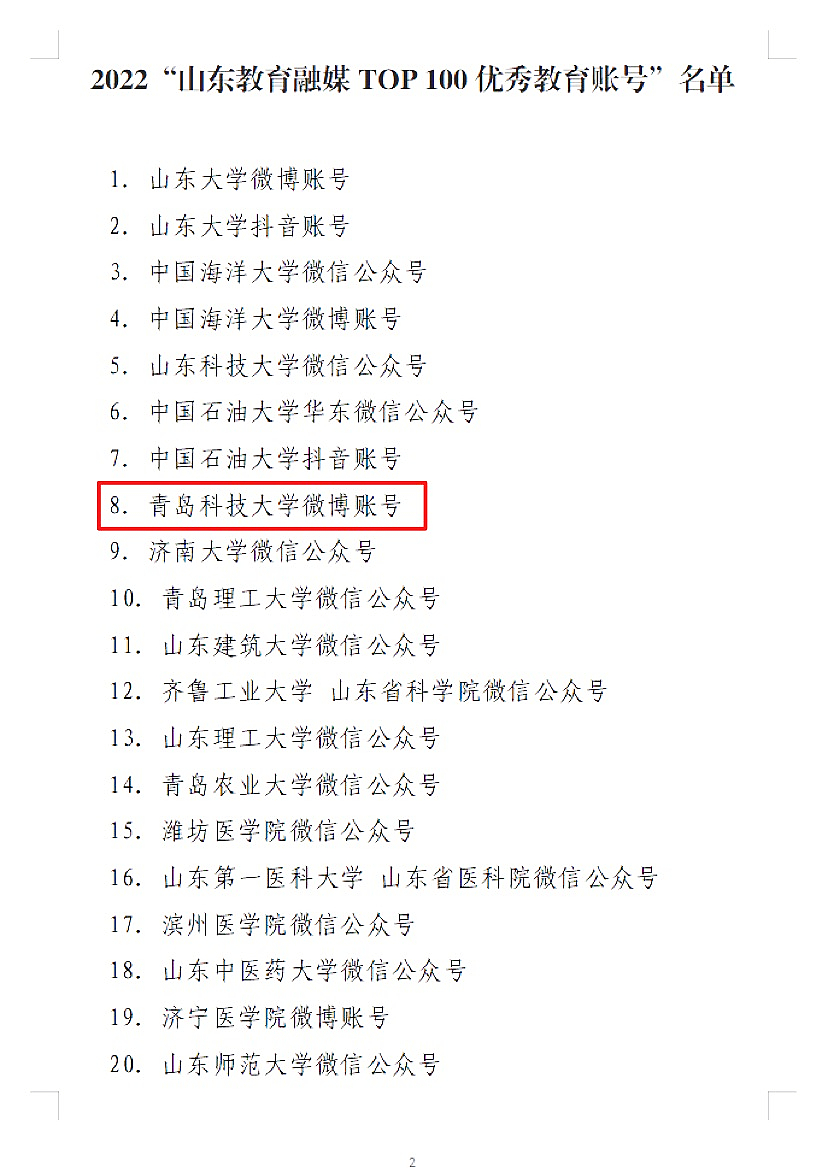 近日,山东教育融媒体联盟公布了2022“山东教育融媒TOP100优秀教育账号”,beat365正版唯一官网微博账号入选,位列山东高校第8位、省属高校第2位。
