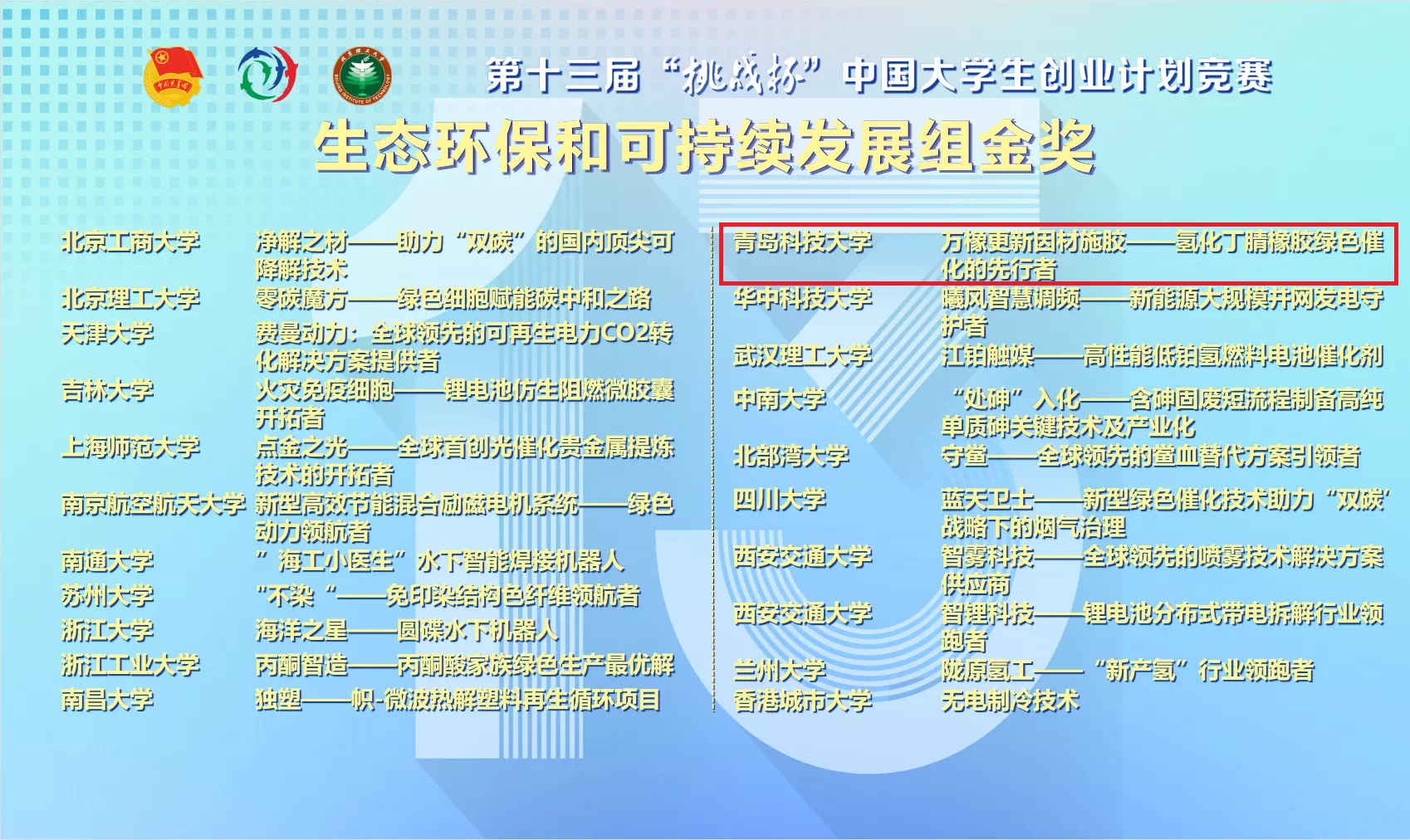 3月17日至19日,第十三届“挑战杯”中国大学生创业计划竞赛全国决赛在北京理工大学举行。本次大赛中,学校共有5个项目入围全国决赛,3个项目进入现场终审答辩,其中《万橡更新因材施胶——氢化丁腈橡胶绿色催化的先行者》(团队负责人:洪子通,第一指导教师:王曼)荣获全国金奖。学校参赛总积分跻身全国前60,成为山东省唯一捧获“优胜杯”的本科高校,实现了赛事重大突破,创造了历史最好成绩!