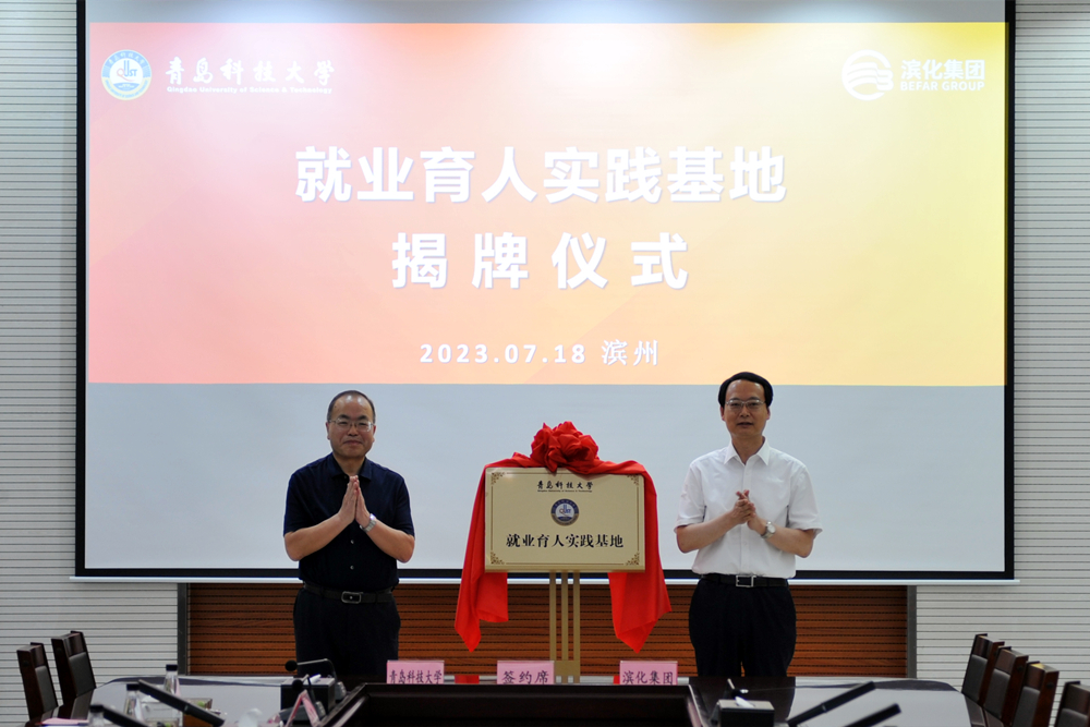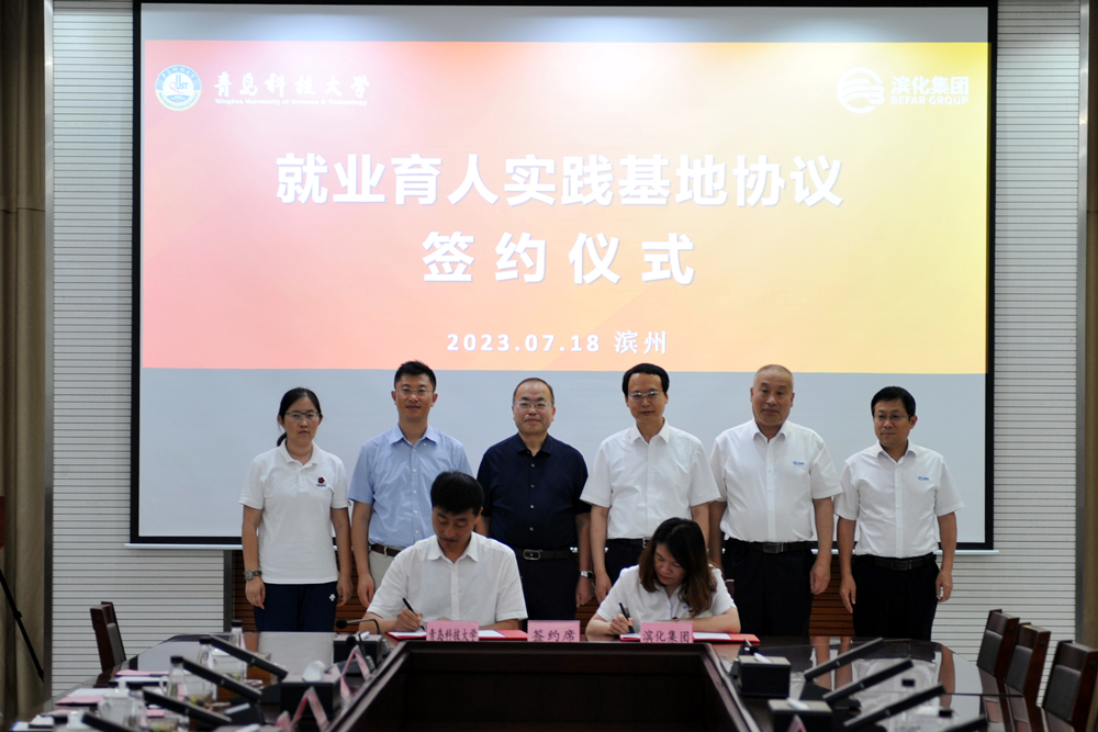 学生处副处长兼就业指导中心主任徐华与滨化集团党委委员、人力资源部总经理丁云霞共同签署就业育人实践基地协议书。