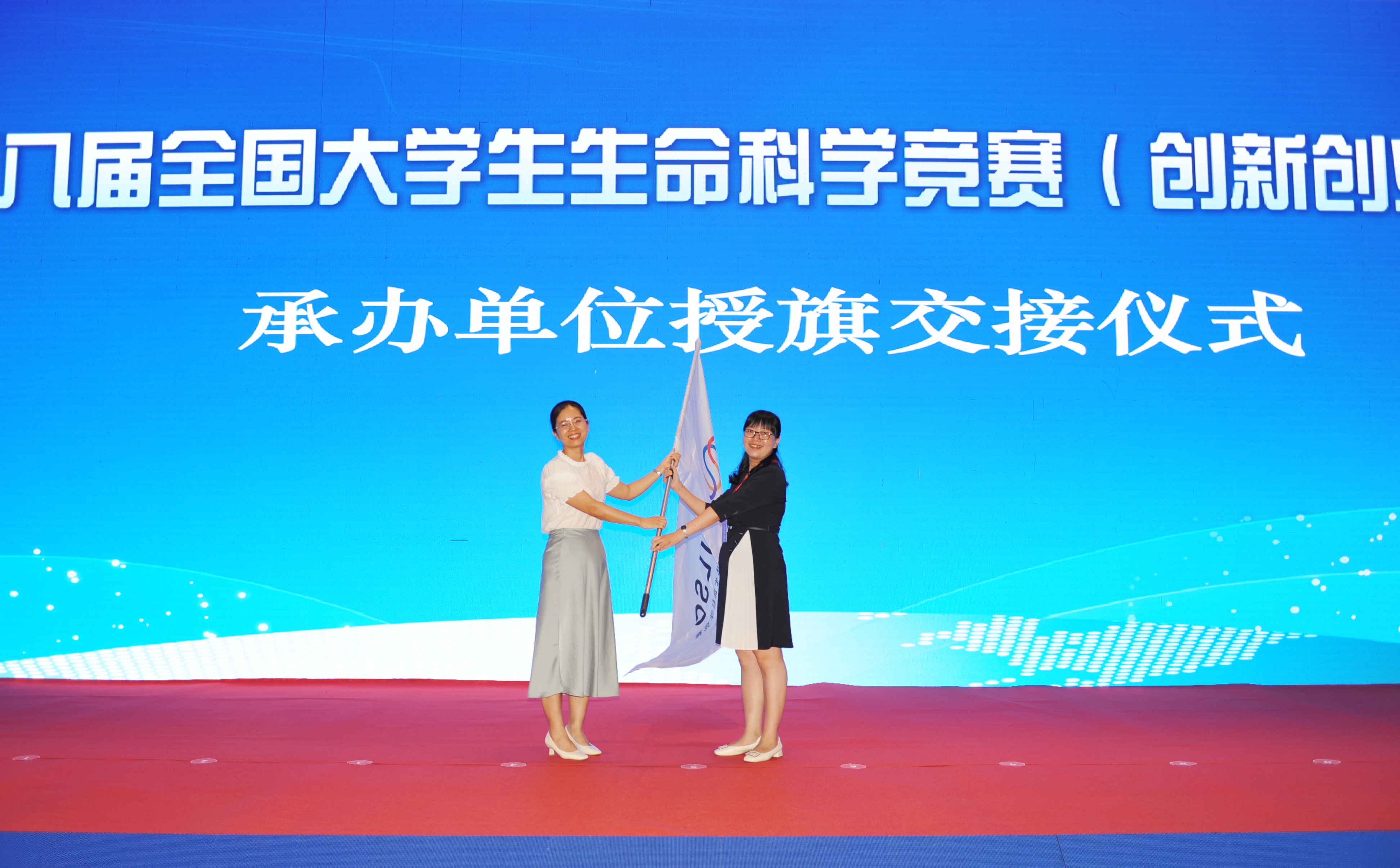 张雪洪宣布西华大学为第九届全国大学生生命科学竞赛(创新创业类)承办高校;beat365化工学院党委书记孙明媚向下一届承办单位交授会旗;第九届大赛承办单位代表、西华大学食品与生物工程学院院长唐洁致辞。
