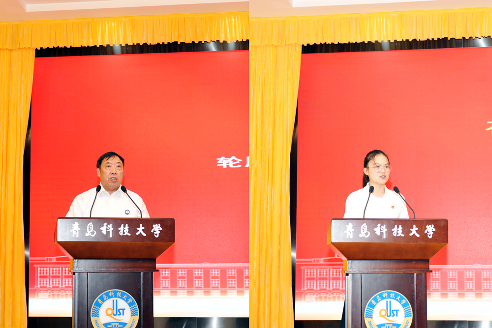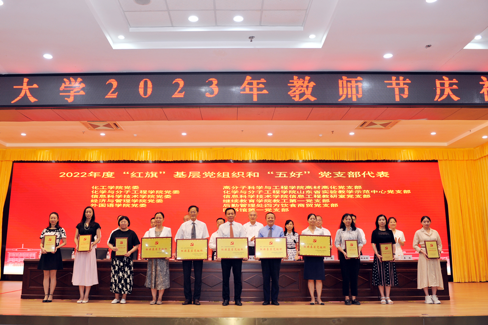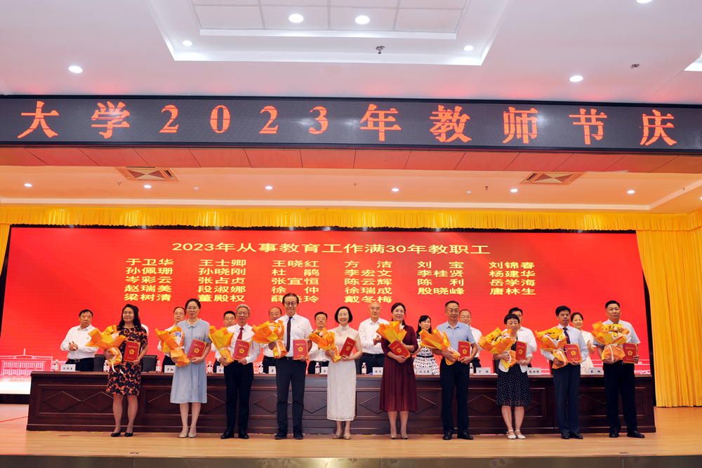 与会领导为获奖教职工及单位颁奖、为新入职教师代表佩戴校徽,学生代表为从事教育工作年满30年的28名教职工及2022年度重要荣誉获奖代表献花。汪传生教授作为教师代表发言,高分子科学与工程学院范婉怡作为学生代表发言。