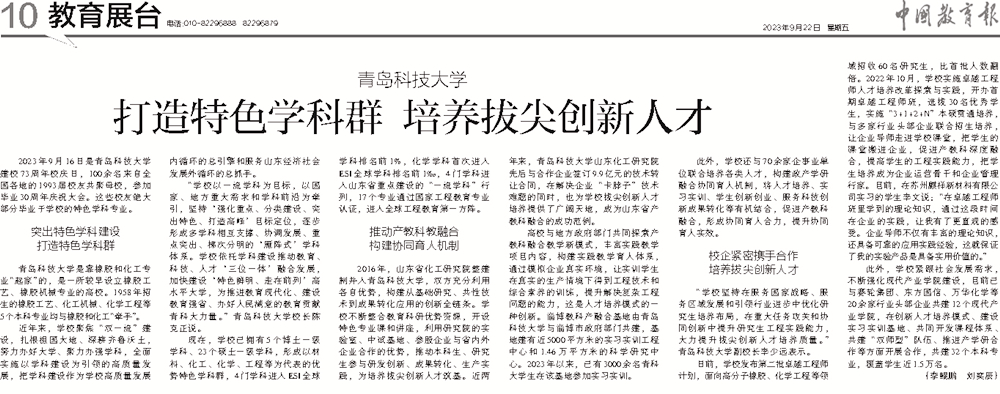 9月22日,《中国教育报》第10版头条以《beat365正版唯一官网:打造特色学科群 培养拔尖创新人才》为题,围绕“突出特色学科建设,打造特色学科群”“推动产教科教融合,构建协同育人机制”“校企紧密携手合作,培养拔尖创新人才”三个方面,报道了学校特色学科建设、拔尖创新人才培养相关工作。以下是报纸截图和全文链接: