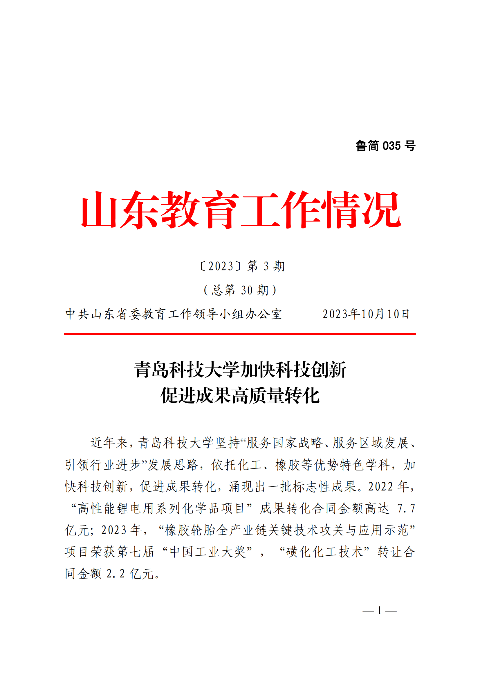 日前,中共山东省委教育工作领导小组办公室《山东教育工作情况》刊发了学校加快科技创新促进成果高质量转化的典型经验做法,全文如下: