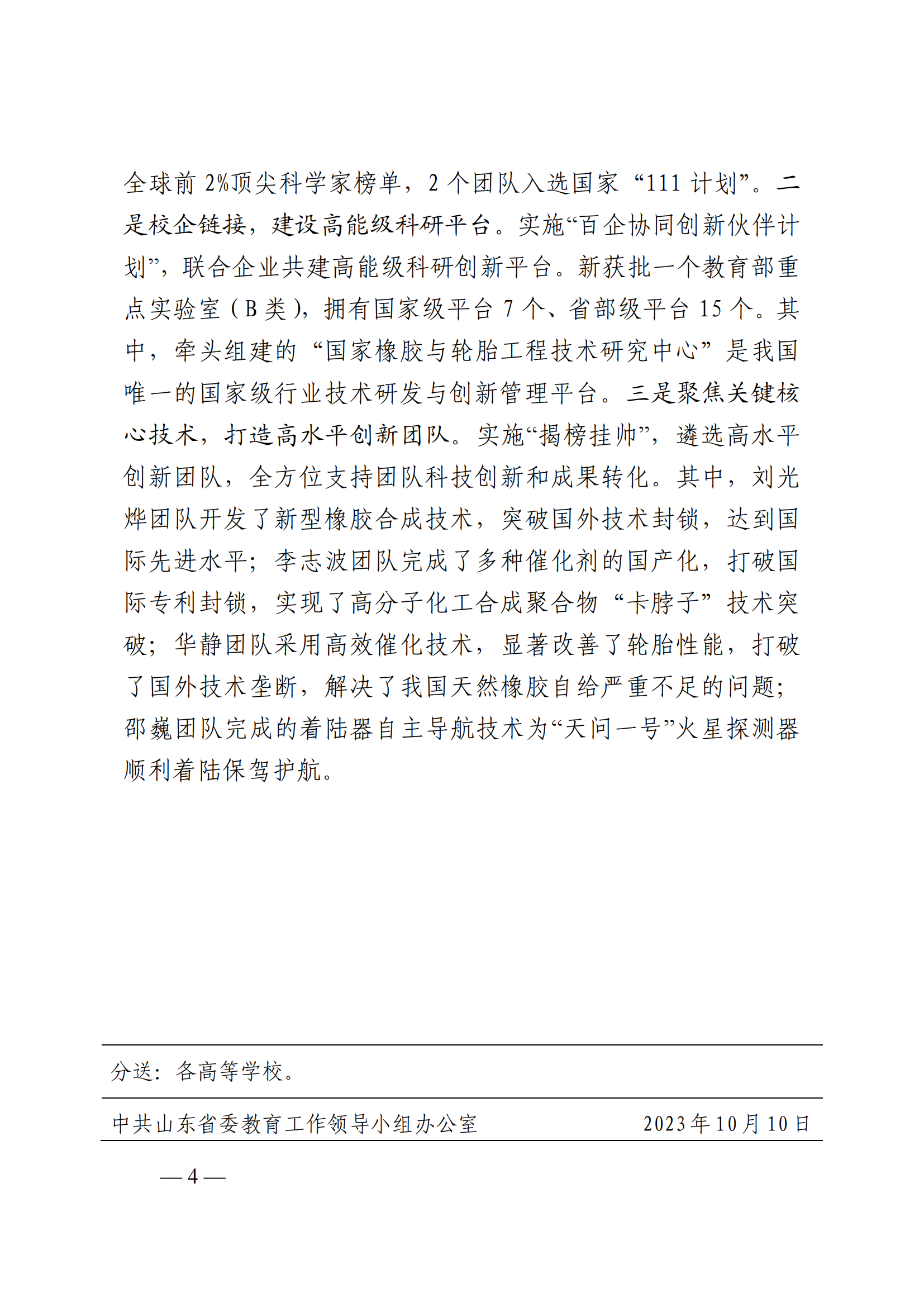 一是引育并举,建设高层次人才队伍。坚持人才强校战略,实施“崂山学者”人才工程,主动融入省“2+N”人才体系,通过“一事一议”整建制引进和培育领军人才团队。“十四五”以来引育院士1人,国家杰青、长江学者等5人,15名教师入围全球前2%顶尖科学家榜单,2个团队入选国家“111计划”。二是校企链接,建设高能级科研平台。实施“百企协同创新伙伴计划”,联合企业共建高能级科研创新平台。新获批一个教育部重点实验室(B类),拥有国家级平台7个、省部级平台15个。其中,牵头组建的“国家橡胶与轮胎工程技术研究中心”是我国唯一的国家级行业技术研发与创新管理平台。三是聚焦关键核心技术,打造高水平创新团队。实施“揭榜挂帅”,遴选高水平创新团队,全方位支持团队科技创新和成果转化。其中,刘光烨团队开发了新型橡胶合成技术,突破国外技术封锁,达到国际先进水平;李志波团队完成了多种催化剂的国产化,打破国际专利封锁,实现了高分子化工合成聚合物“卡脖子”技术突破;华静团队采用高效催化技术,显著改善了轮胎性能,打破了国外技术垄断,解决了我国天然橡胶自给严重不足的问题;邵巍团队完成的着陆器自主导航技术为“天问一号”火星探测器顺利着陆保驾护航。