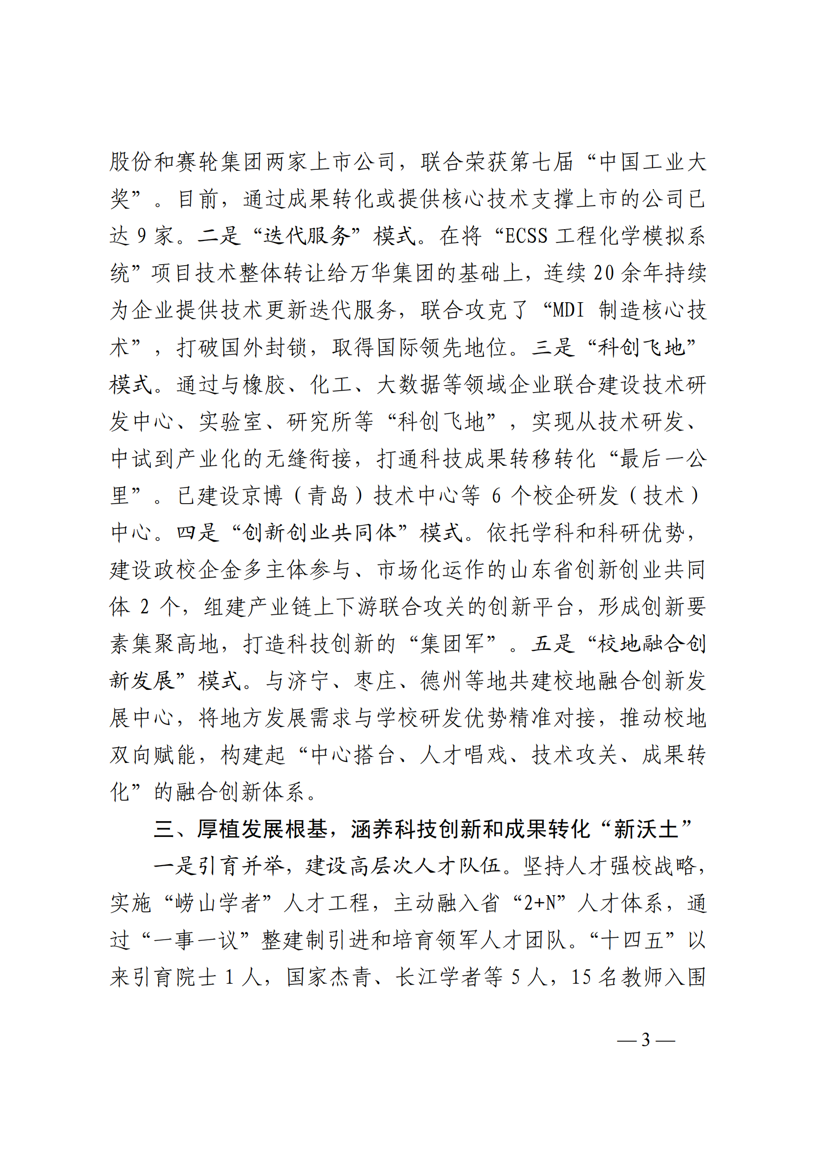 一是“孵化上市”模式。依托国家科技进步二等奖“密炼机上辅机”项目成立校办企业、学科性公司,相继孵化出软控股份和赛轮集团两家上市公司,联合荣获第七届“中国工业大奖”。目前,通过成果转化或提供核心技术支撑上市的公司已达9家。二是“迭代服务”模式。在将“ECSS工程化学模拟系统”项目技术整体转让给万华集团的基础上,连续20余年持续为企业提供技术更新迭代服务,联合攻克了“MDI制造核心技术”,打破国外封锁,取得国际领先地位。三是“科创飞地”模式。通过与橡胶、化工、大数据等领域企业联合建设技术研发中心、实验室、研究所等“科创飞地”,实现从技术研发、中试到产业化的无缝衔接,打通科技成果转移转化“最后一公里”。已建设京博(青岛)技术中心等6个校企研发(技术)中心。四是“创新创业共同体”模式。依托学科和科研优势,建设政校企金多主体参与、市场化运作的山东省创新创业共同体2个,组建产业链上下游联合攻关的创新平台,形成创新要素集聚高地,打造科技创新的“集团军”。五是“校地融合创新发展”模式。与济宁、枣庄、德州等地共建校地融合创新发展中心,将地方发展需求与学校研发优势精准对接,推动校地双向赋能,构建起“中心搭台、人才唱戏、技术攻关、成果转化”的融合创新体系。