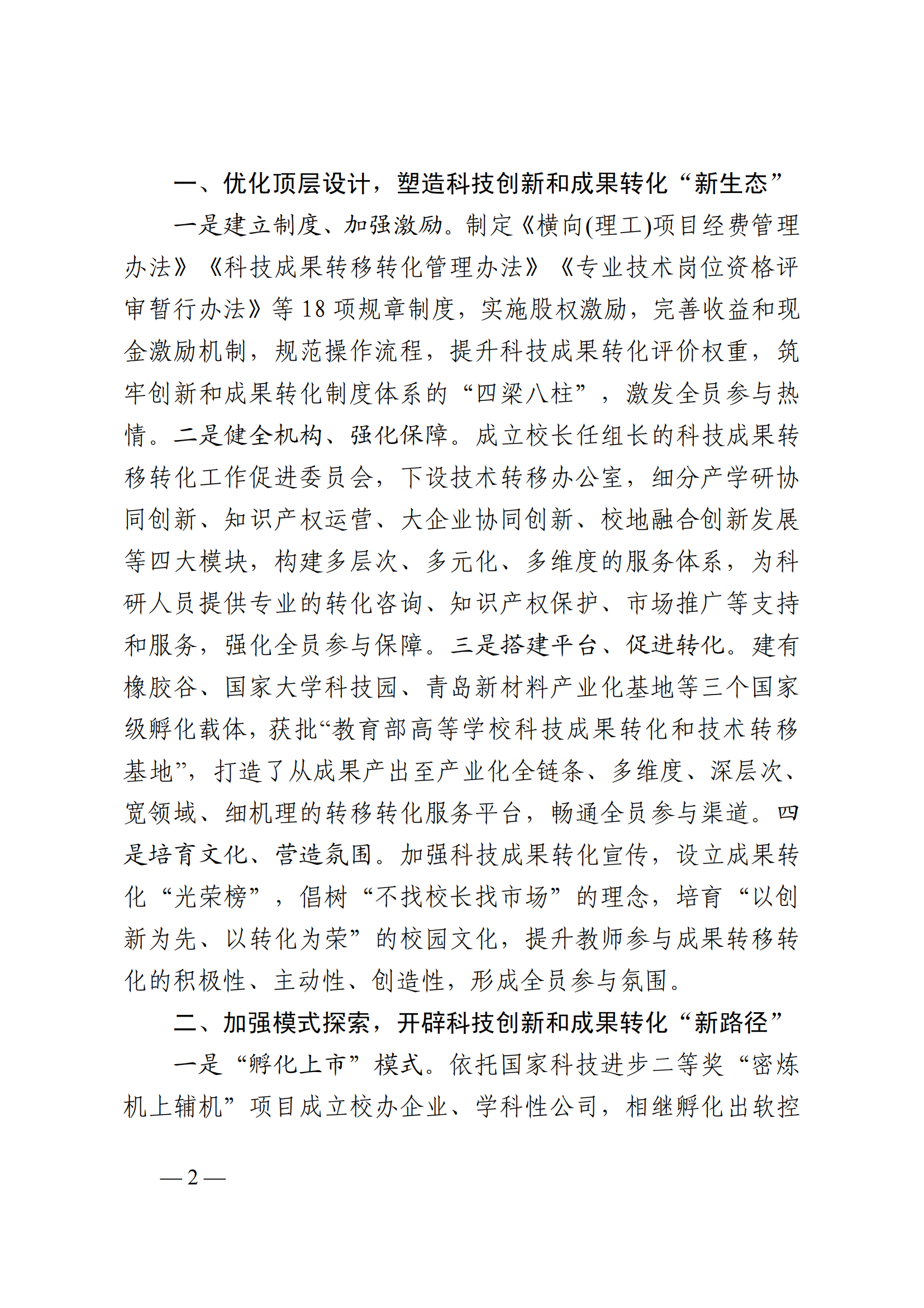 一是建立制度、加强激励。制定《横向(理工)项目经费管理办法》《科技成果转移转化管理办法》《专业技术岗位资格评审暂行办法》等18项规章制度,实施股权激励,完善收益和现金激励机制,规范操作流程,提升科技成果转化评价权重,筑牢创新和成果转化制度体系的“四梁八柱”,激发全员参与热情。二是健全机构、强化保障。成立校长任组长的科技成果转移转化工作促进委员会,下设技术转移办公室,细分产学研协同创新、知识产权运营、大企业协同创新、校地融合创新发展等四大模块,构建多层次、多元化、多维度的服务体系,为科研人员提供专业的转化咨询、知识产权保护、市场推广等支持和服务,强化全员参与保障。三是搭建平台、促进转化。建有橡胶谷、国家大学科技园、青岛新材料产业化基地等三个国家级孵化载体,获批“教育部高等学校科技成果转化和技术转移基地”,打造了从成果产出至产业化全链条、多维度、深层次、宽领域、细机理的转移转化服务平台,畅通全员参与渠道。四是培育文化、营造氛围。加强科技成果转化宣传,设立成果转化“光荣榜”,倡树“不找校长找市场”的理念,培育“以创新为先、以转化为荣”的校园文化,提升教师参与成果转移转化的积极性、主动性、创造性,形成全员参与氛围。