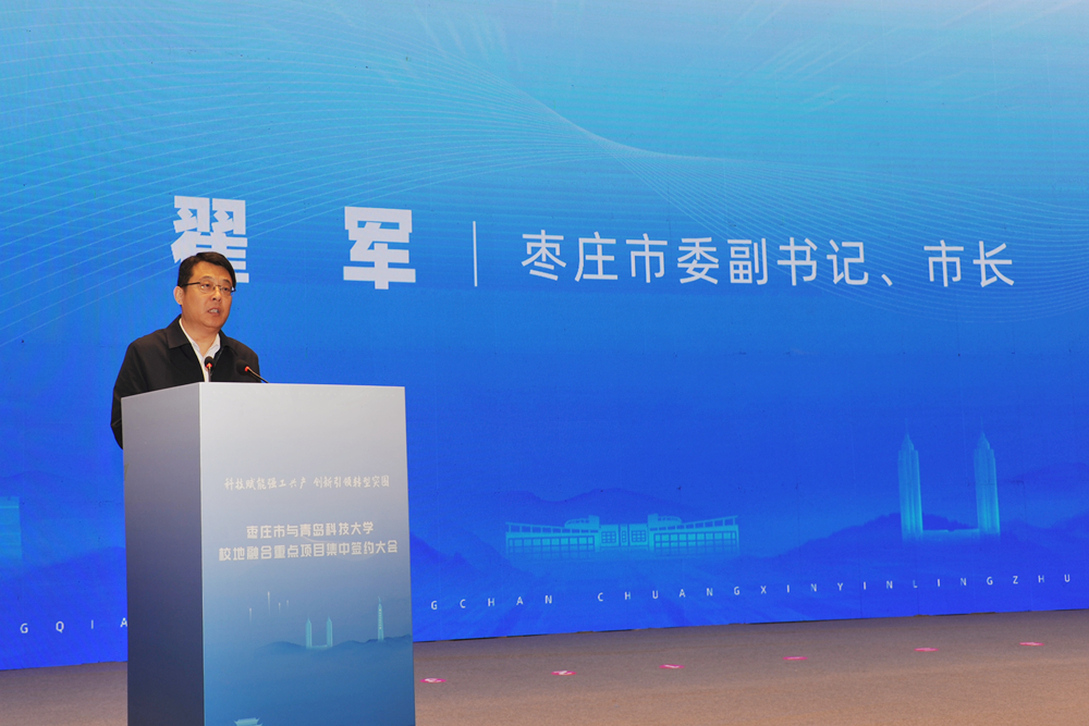 翟军在致辞中表示,beat365正版唯一官网与枣庄市主导产业高度契合,同枣庄校地合作基础扎实、由来已久、不断深化。一直以来,beat365正版唯一官网与枣庄多家企业保持密切合作;今年年初,又同枣庄市签订了校地融合发展战略合作框架协议,成立了融合创新发展中心,取得了阶段性合作成果。本次签订累计1.1亿元的科研成果转化项目,标志着双方合作随之迈向更高水平、取得重大突破、迎来光明前景,也必将为枣庄发展提供强大技术和人才支撑,为推动“强工兴产、转型突围”注入强劲动能。