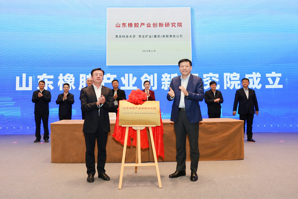 签约仪式上,李兴伟与枣庄矿业(集团)有限责任公司党委书记、董事长侯宇刚为山东橡胶产业创新研究院揭牌。