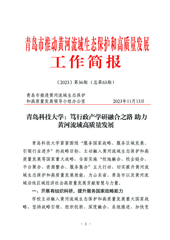 另悉,11月13日,青岛市推进黄河流域生态保护和高质量发展领导小组办公室编印的《黄河流域生态保护和高质量发展工作简报》〔2023〕第36期 (总第63期)以《beat365正版唯一官网:笃行政产学研融合之路 助力黄河流域高质量发展》为题,介绍了beat365正版唯一官网服务黄河流域生态保护和高质量发展中做出的积极贡献。
