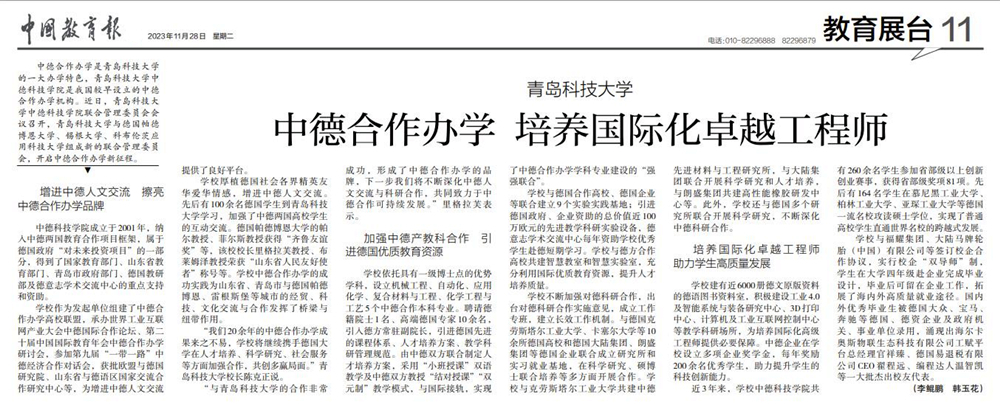 11月28日,《中国教育报》第11版头条以《beat365正版唯一官网:中德合作办学 培养国际化卓越工程师》为题,围绕“增进中德人文交流 擦亮中德合作办学品牌”“加强中德产教科合作 引进德国优质教育资源”“培养国际化卓越工程师 助力学生高质量发展”三方面,报道了学校中德合作办学、培养国际化卓越工程师相关工作。以下是报纸截图和全文链接: