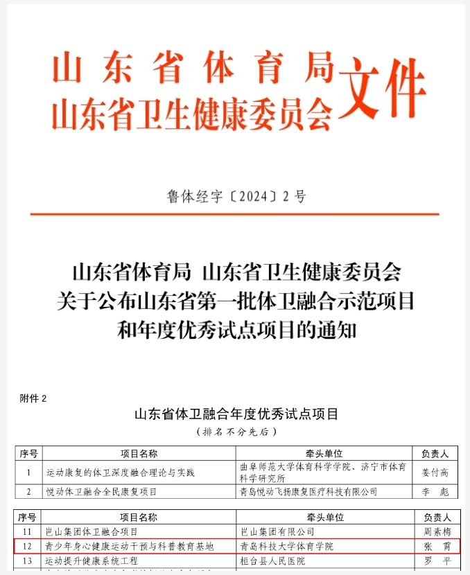 近日,山东省体育局、山东省卫生健康委员会发布《关于公布山东省第一批体卫融合示范项目和年度优秀试点项目的通知》(鲁体经字〔2024〕2号),beat365正版唯一官网体育学院申报的“青少年身心健康运动干预与科普教育基地”获批山东省体卫融合年度优秀试点项目。
