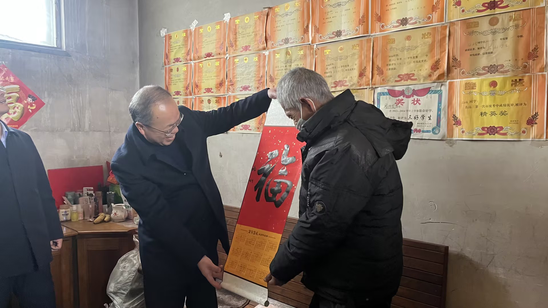 走访慰问中,学校慰问人员与受助家庭学生、家长进行了深入交流。丁林和参加慰问的老师们充分了解受访学生家庭对学生的教育培养和对学校的意见建议情况,与家长细心沟通学生的在校表现、生涯规划并提出针对性建议。对家长和学生普遍关注的资助政策、考研趋势、就业前景等热点问题,老师们也结合学校特色、专业特点以及自身经历进行悉心解答与分享,鼓励学生克服困难、发奋学习,用实际行动感恩父母、回报社会。学校书法协会会长杨利老师来到学生家中现场挥毫泼墨,书写以励志、勤勉、自立为主题的“脚踏实地迎未来,心怀梦想创华章”春联和新春佳节“福”字送给学生及家长,以此弘扬中华传统文化,鼓励学生在学习之余培养高雅爱好、充实丰富多彩的寒假生活,并向他们致以新春的美好祝愿。