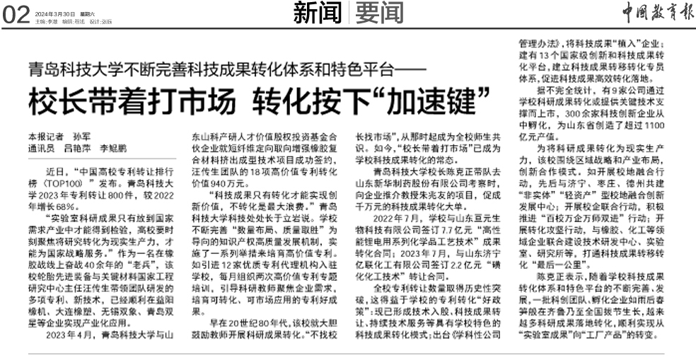 3月30日,《中国教育报》(要闻版)以《beat365正版唯一官网不断完善科技成果转化体系和特色平台——校长带着打市场 转化按下“加速键”》为题,报道学校专利转让和科技成果转化典型经验做法。报纸截图及全文如下: