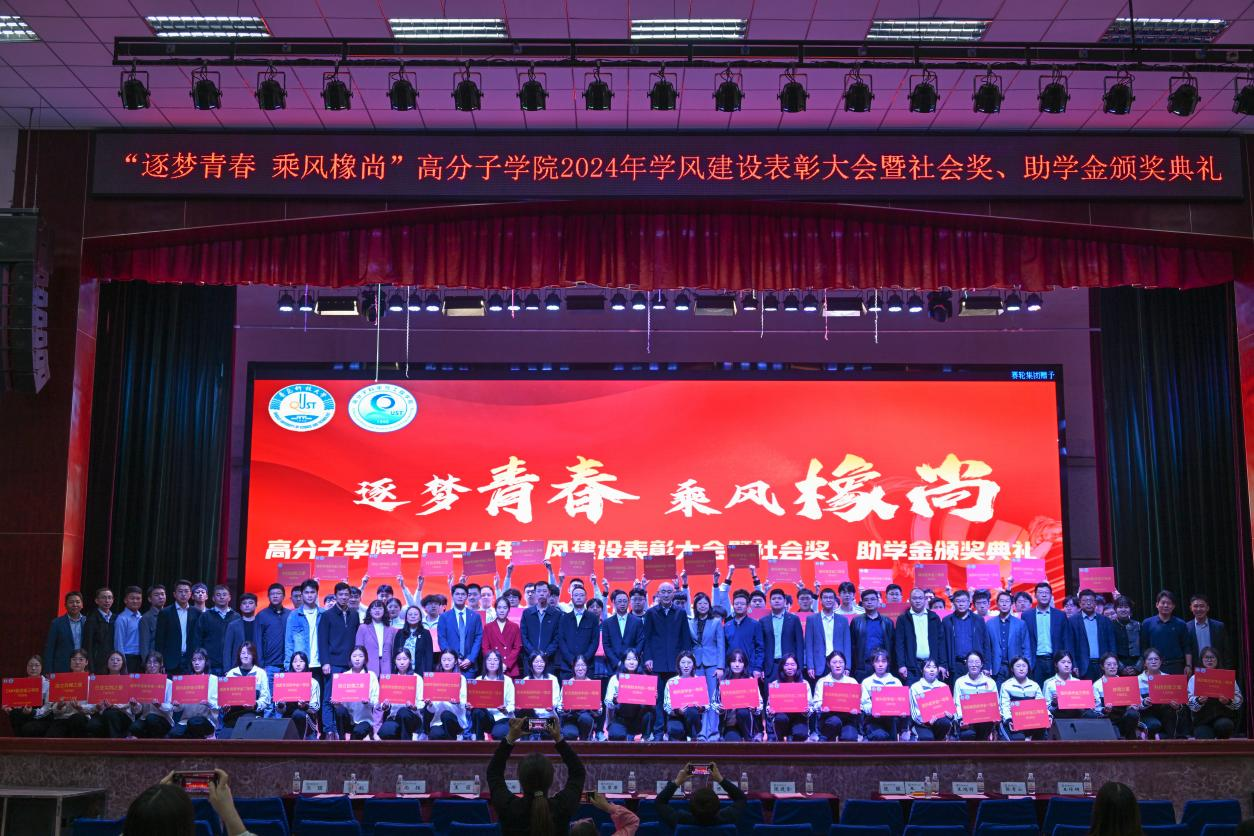 5月7日,高分子学院“逐梦青春 乘风橡尚”2024年学风建设表彰大会暨社会奖助学金颁奖典礼在四方校区举行。校长陈克正出席典礼,为2023年度高分子学院“五星高材生”颁奖,并为2023年度设奖助学金企业代表颁发捐赠证书、最佳合作企业奖牌。本年度社会奖助学金首次涵盖16名高密校区高材系学生。