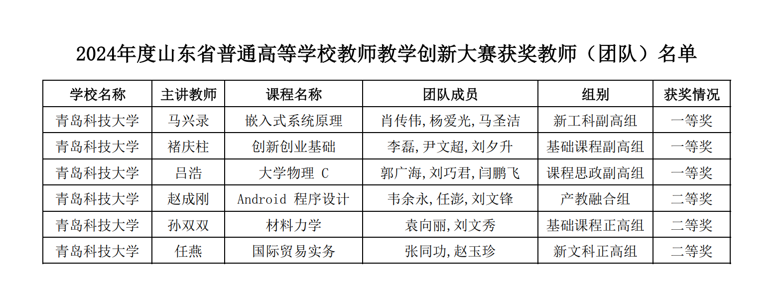 近日,山东省教育厅公布了2024年度山东省普通高等学校教师教学创新大赛获奖名单,beat365正版唯一官网在教师教学创新大赛中再创佳绩,其中马兴录《嵌入式系统原理》教学团队获得一等奖并推荐至国赛,褚庆柱《创新创业基础》教学团队、吕浩《大学物理C》教学团队获得一等奖;赵成刚教学团队、孙双双教学团队、任燕教学团队获得二等奖。