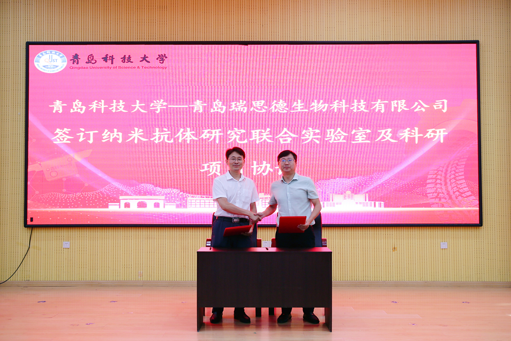 顾玉超介绍了学院的基本情况和发展目标与思路,并代表学院分别与青岛蔚蓝生物股份有限公司、青岛瑞思德生物科技有限公司签订共建合成生物学现代产业研究院、纳米抗体研究联合实验室及科研项目协议。