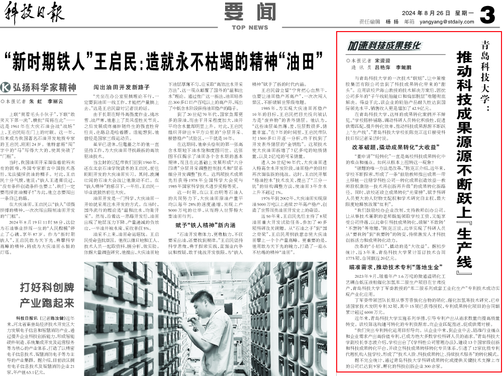 8月26日,《科技日报》要闻版以《beat365正版唯一官网:推动科技成果源源不断跃上“生产线”》为题,宣传报道学校在科技成果转化方面的典型经验做法和工作成效。