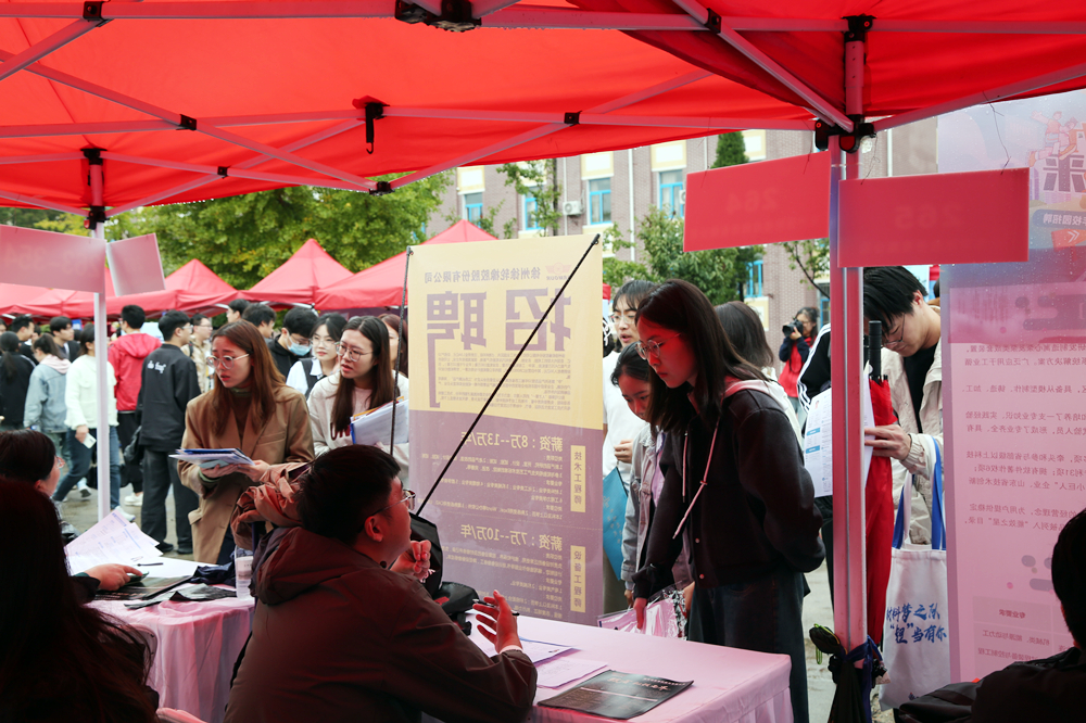 双选会开始前的中到大雨给见面会的举行带来了巨大考验,但是用人单位参会热情依旧高涨,到场率高达99%,雨中的求职双选,搭建了参会企业和学生双向奔赴的良好平台。毕业生打着雨伞、着雨衣求职积极,人潮涌动,整个招聘现场井然有序,呈现出供需两旺的良好局面。众多毕业生在各招聘展位间流连穿梭,不时驻足查看招聘简章。用人单位热情地向毕业生介绍企业的招聘岗位、薪资结构及发展前景等情况。