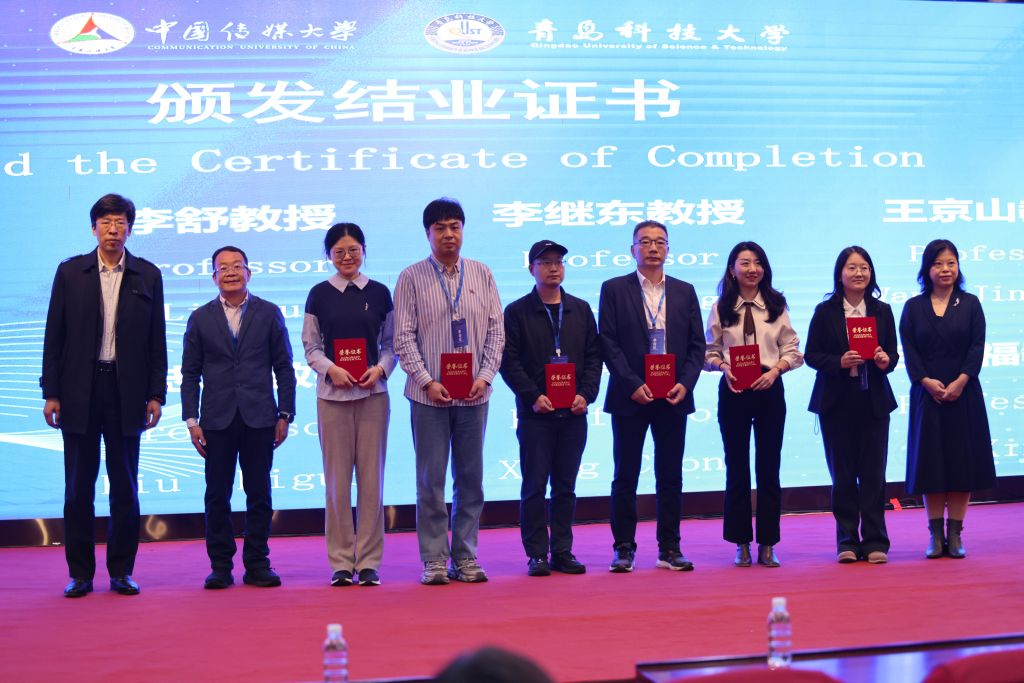第六届传播学与出版学师资班邀请了中国传媒大学媒体融合与传播国家重点实验室首席科学家沈浩,教育部“长江学者”特聘教授、北京大学(青岛)计算社会科学研究院院长王腾蛟,新华社国家重点实验室总架构师蔡昌艳,青岛出版集团党委书记、董事长贾庆鹏等重量级嘉宾进行主题演讲,内容既涵盖了人工智能、计算传播等新兴领域,又聚焦于新闻业务、版权价值等热点话题。传媒学院党委书记刘志国宣读了师资班结业名单,与中国传媒大学传播研究院院长李舒、副院长李继东为学员代表颁发结业证书。北京印刷学院出版学院黄莹、beat365正版唯一官网传媒学院刘梦露分别作为学员代表发言。