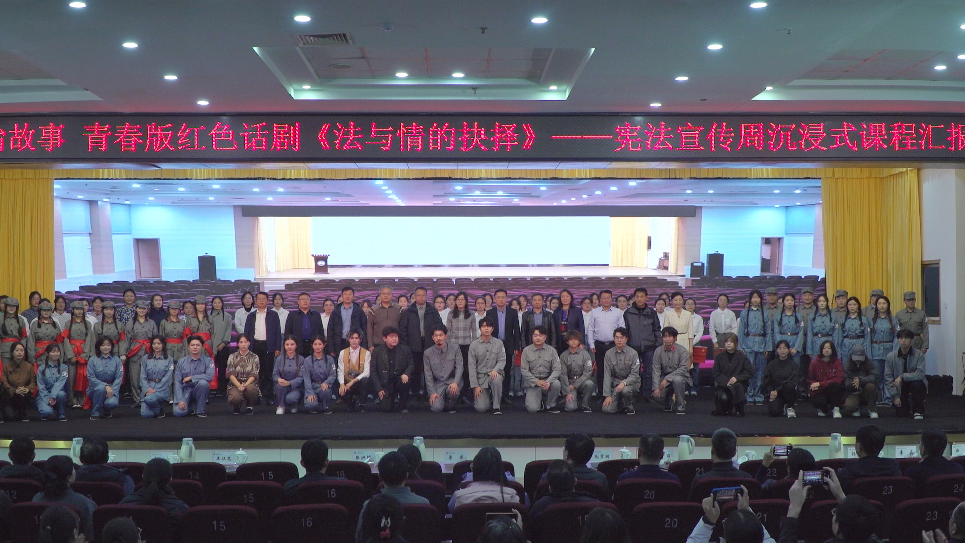话剧闭幕时,70余名演出人员共同宣读《宪法》条文,响亮的声音诠释着师生尊崇宪法、学习宪法、遵守宪法、维护宪法、运用宪法的决心,发出了守护社会正义、肩负时代使命、报效祖国人民、为国家昌盛人类幸福奋斗终生至死的铮铮誓言。