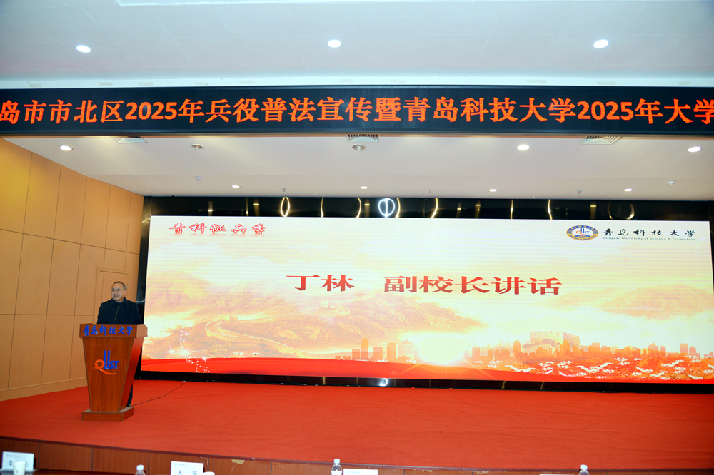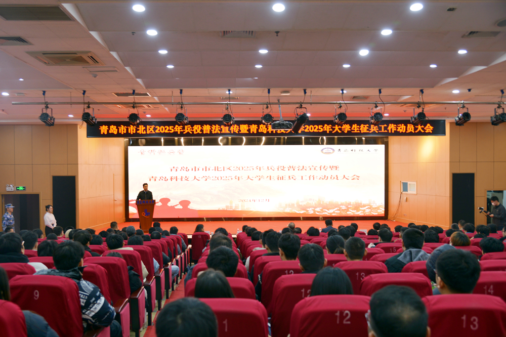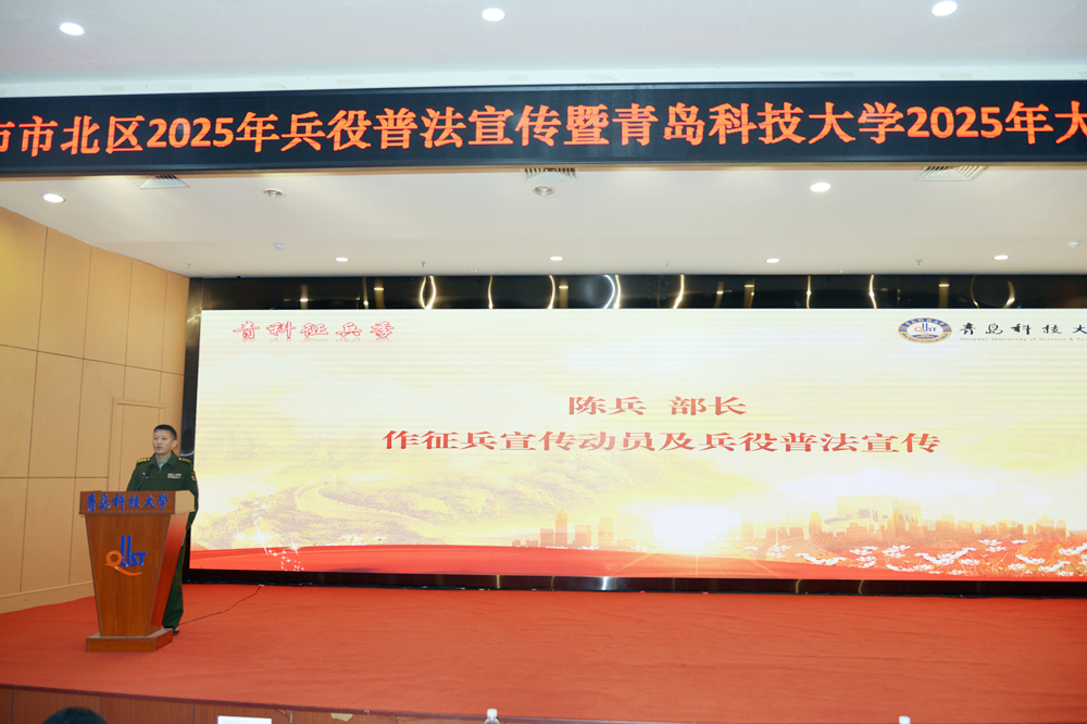 12月25日,青岛市市北区2025年兵役普法宣传暨beat365正版唯一官网2025年大学生征兵工作动员大会在崂山校区举行。青岛市市北区委常委、市北区征兵办主任、市北区人民武装部部长陈兵,学校党委常委、副校长丁林,党委常委、宣传部长张洪坤和学校相关部门负责人出席活动。