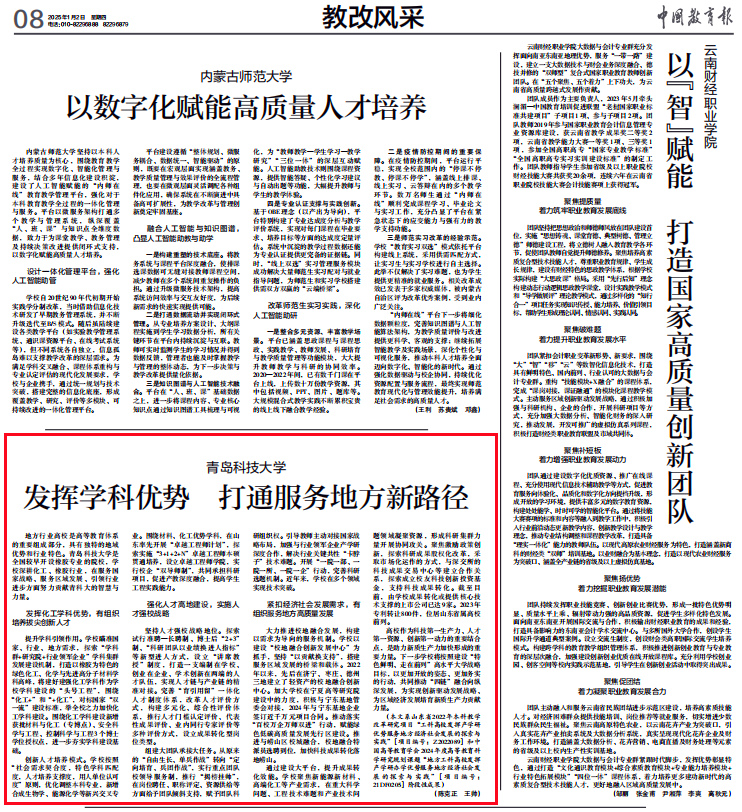 1月2日,《中国教育报》以《beat365正版唯一官网:发挥学科优势 打通服务地方新路径》为题,从“发挥化工学科优势,有组织培养拔尖创新人才”“强化人才高地建设,实施人才强校战略”“紧扣经济社会发展需求,有组织服务地方高质量发展”三个方面,对学校通过发挥学科优势,创新人才培养,强化人才建设,服务地方发展,提升成果转化效能,为实现创新驱动发展战略和区域经济发展培育新质生产力贡献力量等典型经验进行了报道,以下是报道全文: