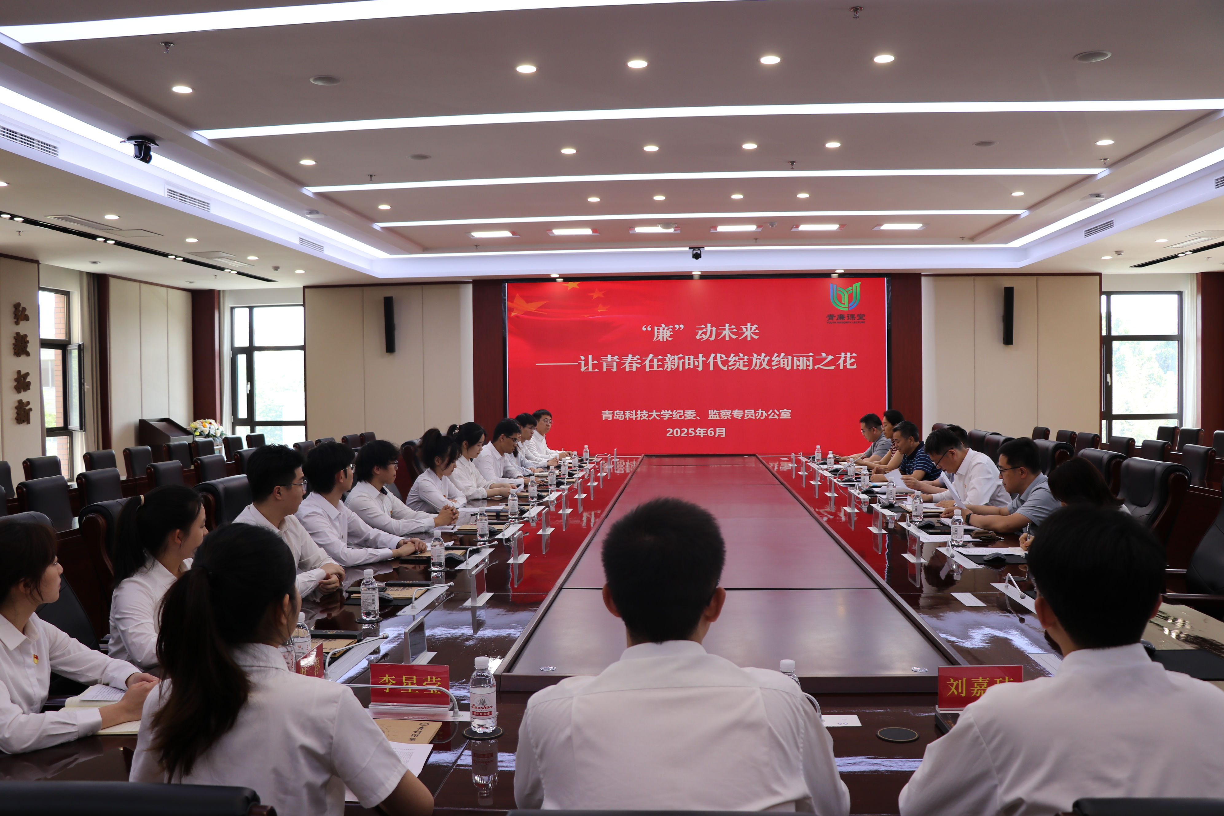 为推动深入贯彻中央八项规定精神学习教育走深走实,6月12日下午,学校在崂山校区赛轮会议室举办2025届毕业生党员座谈会暨“廉”动未来廉洁从业警示教育课。党委常委、组织部部长朱敬义,党委办公室(校长办公室)主任兼党委巡察工作办公室主任毛常明,纪委副书记王江忠参加活动。