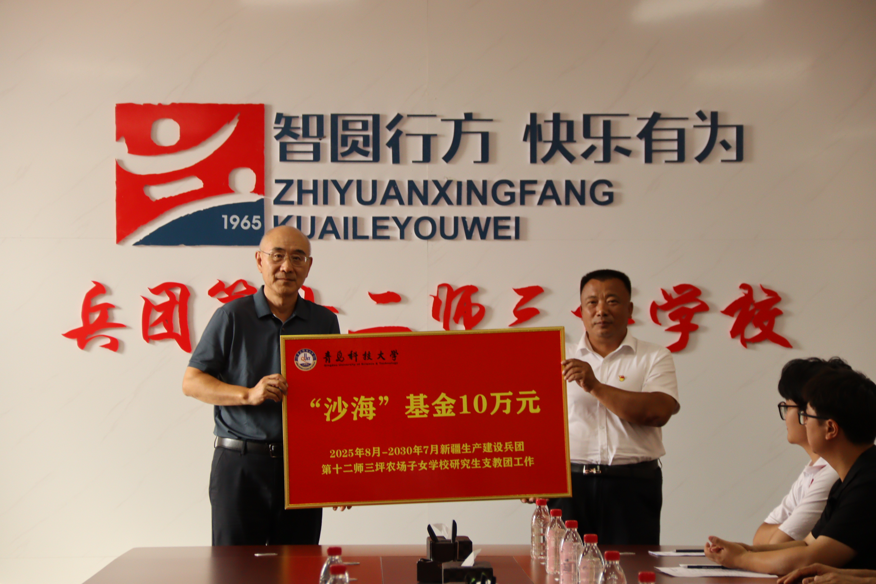 座谈会上,陈克正介绍了学校发展情况,对新疆生产建设兵团第十二师相关部门、单位对学校研究生支教团工作的支持表示感谢,希望支教团成员们能够弘扬“科大精神”,践行“橡胶品格”,坚定理想信念、厚植家国情怀、练就过硬本领、发扬奋斗精神,在祖国和人民最需要的地方发光发热,在推动西部地区教育高质量发展等方面取得更大成果,为中国式现代化建设贡献青春力量。陈克正代表学校向新疆生产建设兵团第十二师三坪农场子女学校捐赠10万元“沙海基金”。