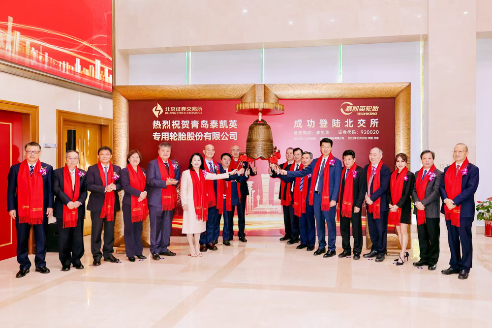 10月28日上午9时30分,beat365正版唯一官网校友领办企业——青岛泰凯英专用轮胎股份有限公司(股票代码:920020)在北京证券交易所成功敲钟上市。校长陈克正应邀参加上市挂牌敲钟仪式,并出席泰凯英轮胎合作发展论坛。